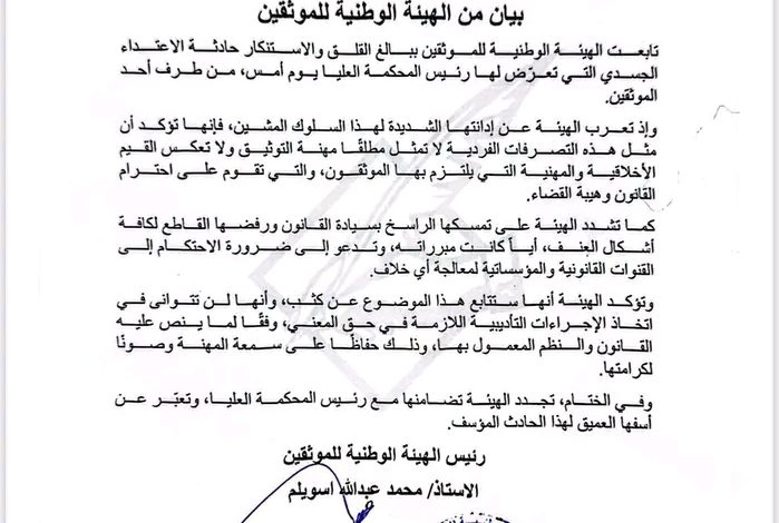 تابعت الهيئة الوطنية للموثقين ببالغ القلق والاستنكار حادثة الاعتداء الجسدي التي تعرّض لها رئيس المحكمة العليا يوم أمس، من طرف أحد الموثقين.