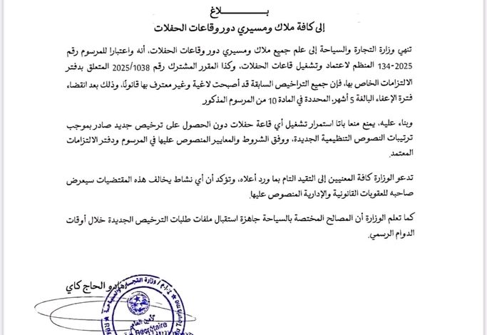 وأكدت الوزارة في بلاغ صادر اليوم ، أن هذا القرار يأتي تنفيذا لأحكام المرسوم رقم 134-2025 الذي ينظم اعتماد وتشغيل قاعات الحفلات، وكذلك القرار المشترك رقم 1038/2025 المتعلق بدفتر الالتزامات الخاص بها.