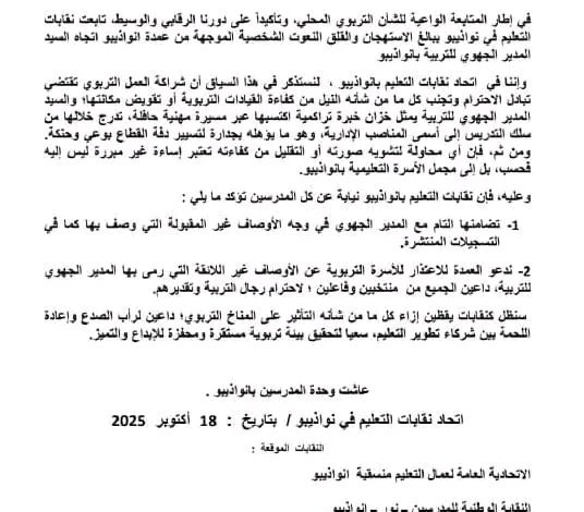 اتحاد نقابات التعليم بانواذيبو : يتضامن مع المدير الجهوي للتربية، ويدعو العمدة للاعتذار للمدرسين