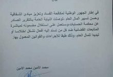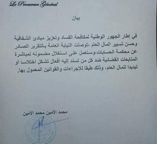 وأوضحت النيابة في بيان وقعه المدعي العام محمد الأمين محمد الأمين أن هذه الخطوة تأتي في إطار الجهود الوطنية لمكافحة الفساد وتعزيز مبادئ الشفافية وحسن تسيير المال العام مشددا على أن النيابة ستتخذ الإجراءات اللازمة طبقا للقوانين المعمول بها.