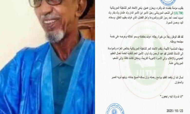 بقلوب مؤمنة بقضاء الله وقدره، وبحزن عميق، ينعى الاتحاد الحر للشغيلة الموريتانية (ULTM) إلى الشعب الموريتاني رحيل الأمير ابن الأمير الدان ولد عثمان ولد بكار ولد اسويد أحمد، أحد رموز الكرم والمروءة وأهل الفضل، الذي عُرف بطيب الخلق، وسخاء اليد، وحسن السيرة.