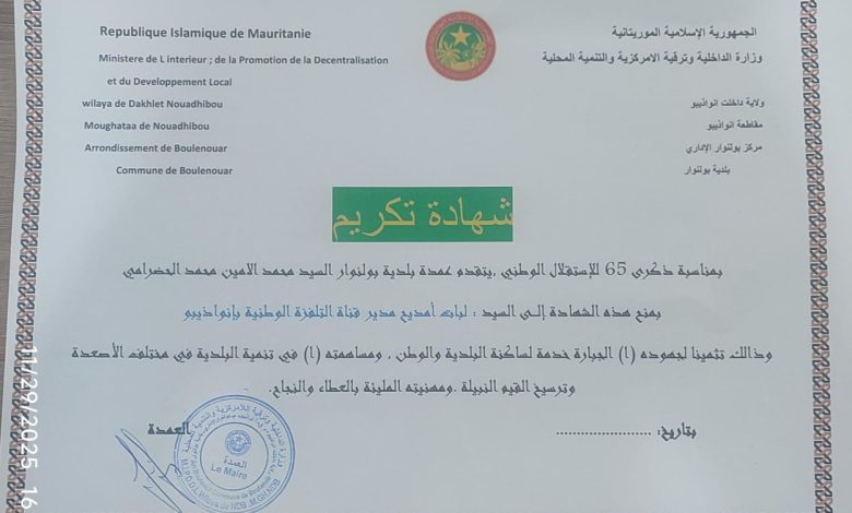 كرمت بلدية بولنوار المدير الجهوي لمكتب قناة الموريتانية على مستوى ولاية داخلت نواذيبو ” لبات ولد امديح “وذلك بمناسبة حفل تخليد الذكرى 65 لعيد الاستقلال الوطني.