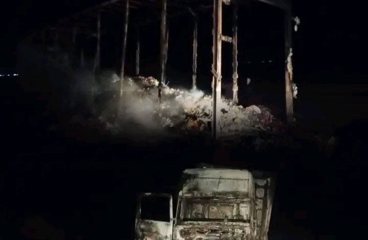 شب ليلة البارحة حريق في شاحنة مغربية محملة بالمواد الغذائية و الأقمشة على الطريق الوطني قرب مدينة الشامي .