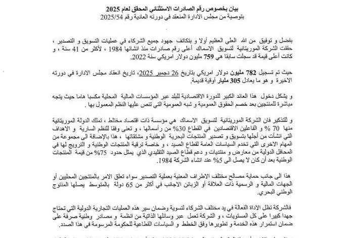 أعلنت الشركة الموريتانية لتسويق الأسماك (SMCP) عن تحقيق رقم صادرات استثنائي خلال سنة 2025، بلغ 782 مليون دولار أمريكي إلى غاية 26 دجمبر 2025، وذلك تنفيذًا لتوصية مجلس إدارتها المنعقد في دورته العادية.