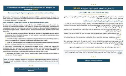 قالت الجمعية المهنية للبنوك الموريتانية ، ان الإضراب الذي سيقوم به تجمع نقاط التحويل الرقمي ، لن يكون له أي تأثير على النشاط المصرفي بصفة عامة، ولا على نشاط التطبيقات الرقمية بصفة خاصة، ولا على السير الطبيعي والمعتاد للنشاط المالي.