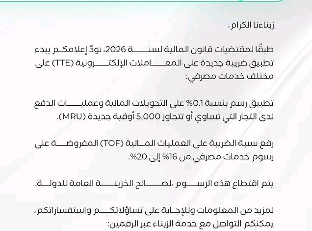 وأضاف في بيان: طبقًا لمقتضيات قانون المالية لسنة 2026، نودّ إعلامكم ببدء تطبيق ضريبة جديدة على المعاملات الإلكترونية (TTE) على مختلف عمليات مصرفي: