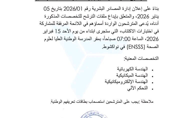 دعت الشركة الوطنية للصناعة والمناجم “سنيم”، المترشحين لإجراء اختبارات اكتتاب المهندسين، معلنة أن موعدها سيكون يوم الأحد الموافق 15 فبراير عند الساعة السابعة صباحا، بمقر المدرسة الوطنية العليا لعلوم الصحة في نواكشوط.