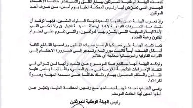 بيان من الهيئة الوطنية للموثقين تابعت الهيئة الوطنية للموثقين ببالغ القلق والاستنكار حادثة الاعتداء الجسدي التي تعرّض لها رئيس المحكمة…